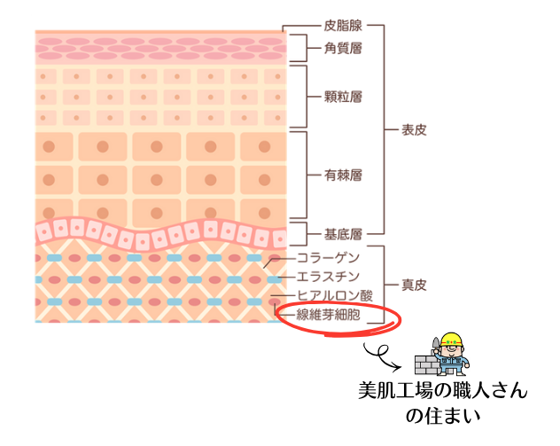 私たちの肌の奥深くにある「真皮(しんぴ)」という層には、線維芽細胞(せんいがさいぼう)という、肌の弾力や潤いを守る成分を作り出す、いわば「美肌工場」で働く職人さんがいます。